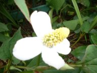 | ドクダミの花といえば、白い花をイメージしますが、白い花びらのようにみえるものは包葉であり、葉の変形したものです。 中心部の棒状部分にたくさんついているひとつひとつの小さい黄色のものが本当の花です。 |